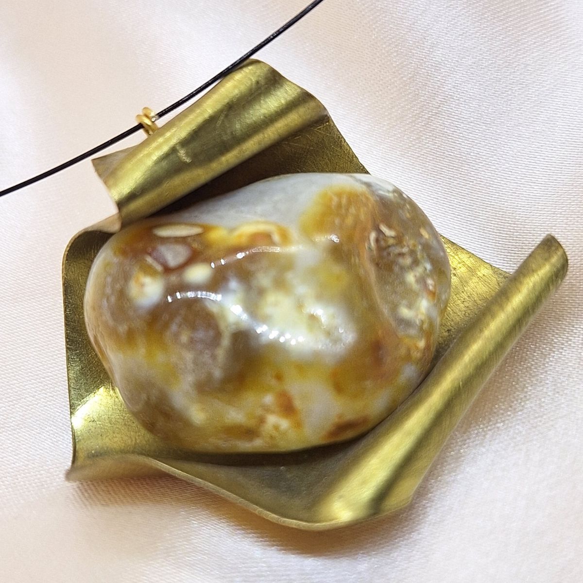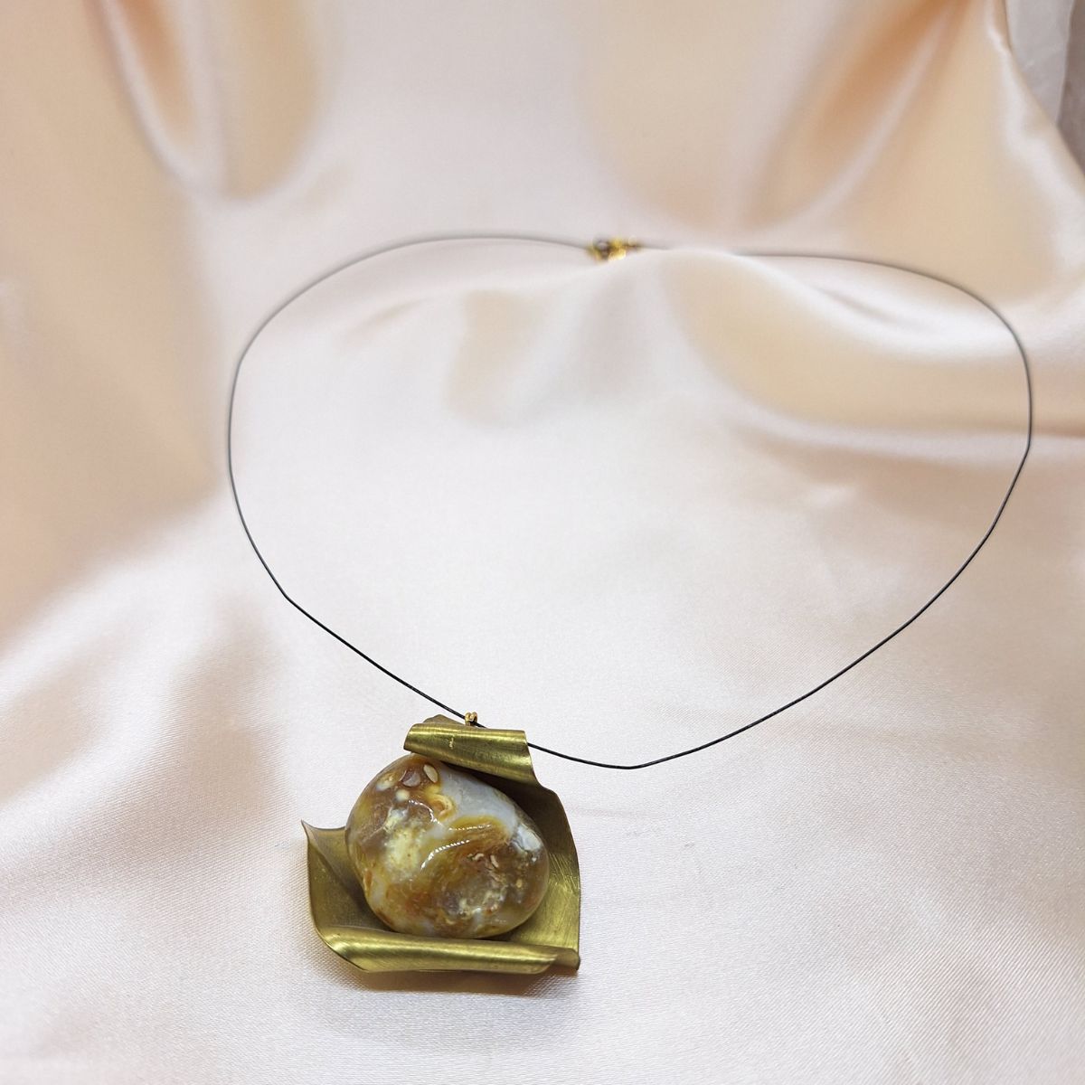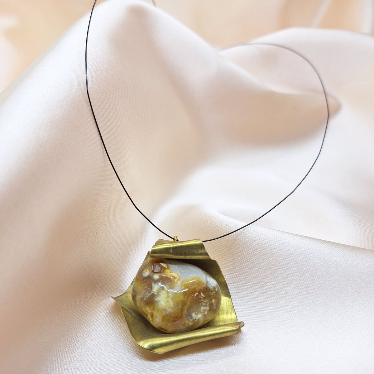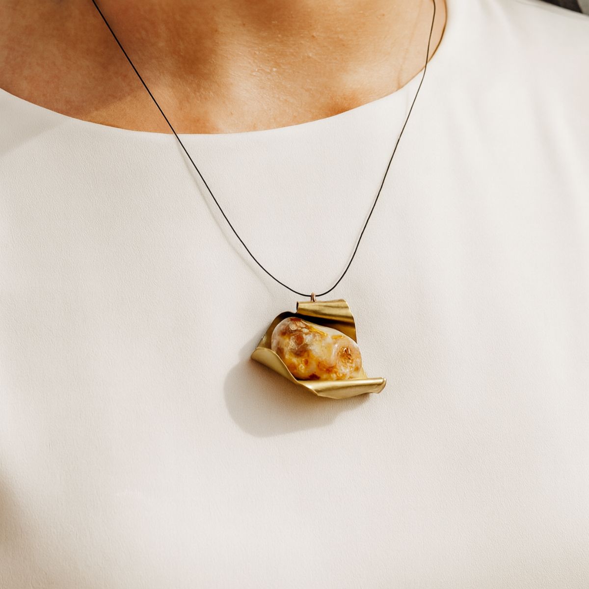 Ogrlica Ahatna nota oblikovana je oko snažnog odnosa metala i kamena. Centralni element od ahata smješten je u metalnu strukturu naglašene plohe, čime se ističe kontrast između organske teksture kamena i čvrstoće metala.