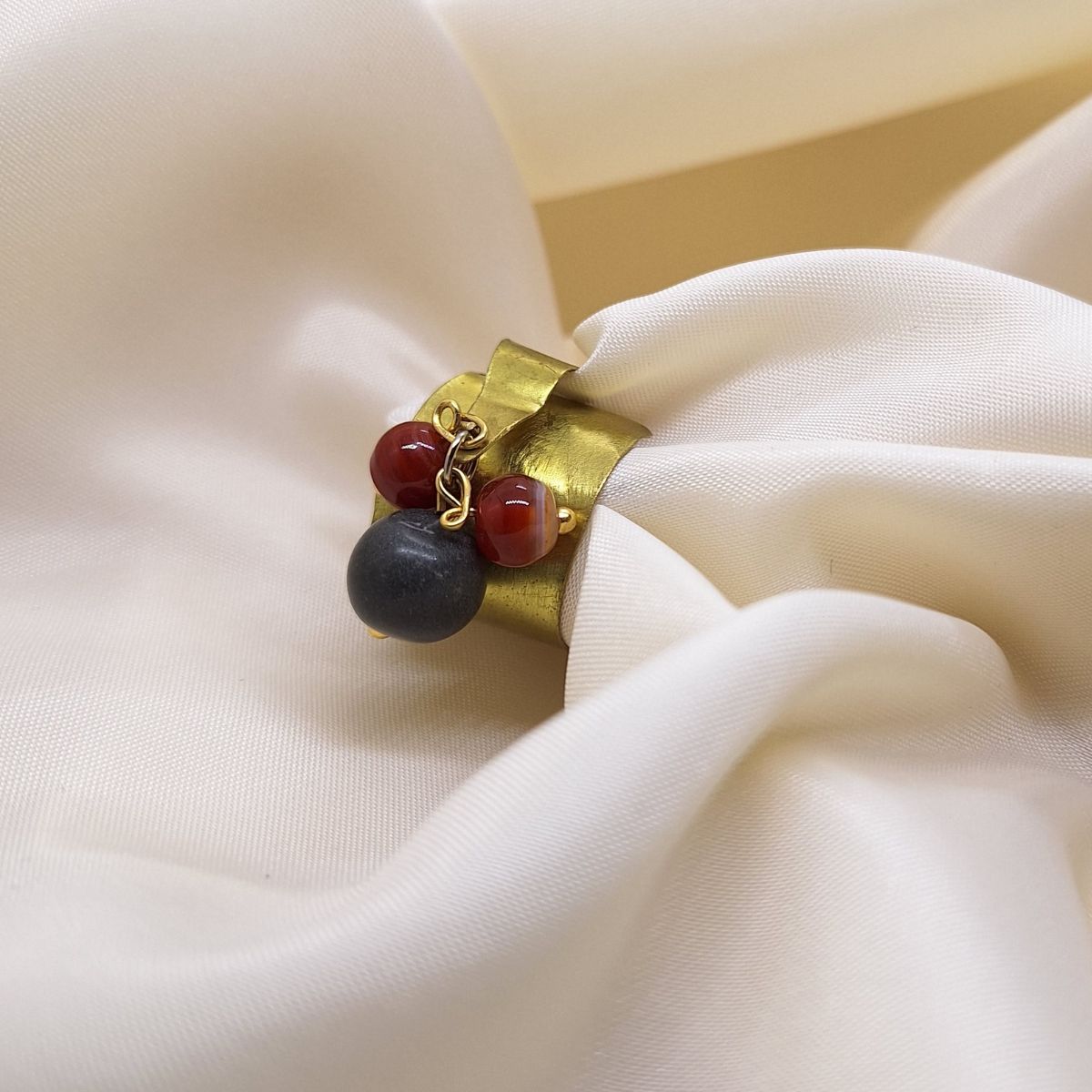 Prsten Zlatni nabor oblikovan je kao čista metalna forma s naglaskom na jednostavnost konstrukcije i jasnoću linije. Savijena ploha mjedi stvara stabilnu bazu, dok ahat unosi suptilan kontrast u materijalu i boji.