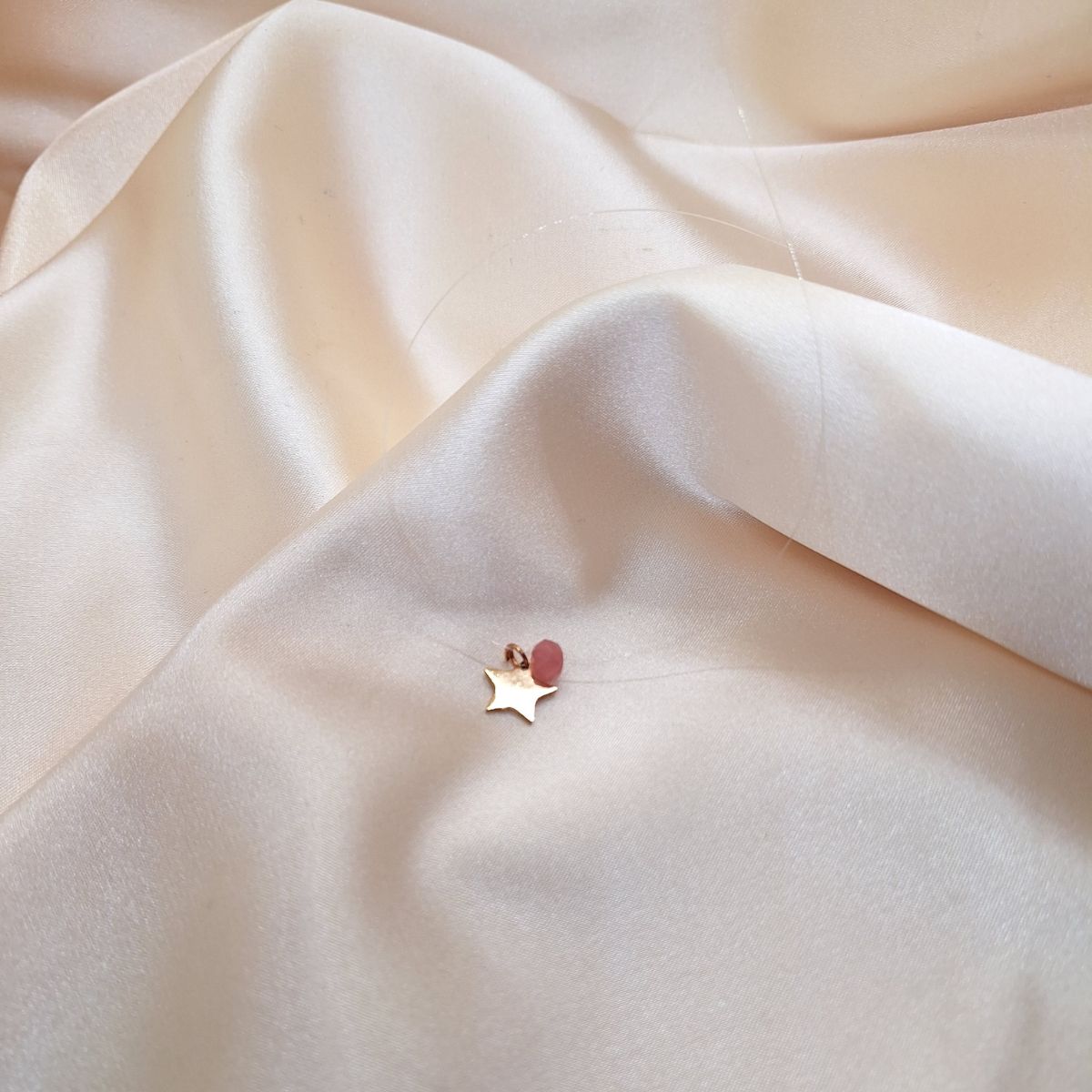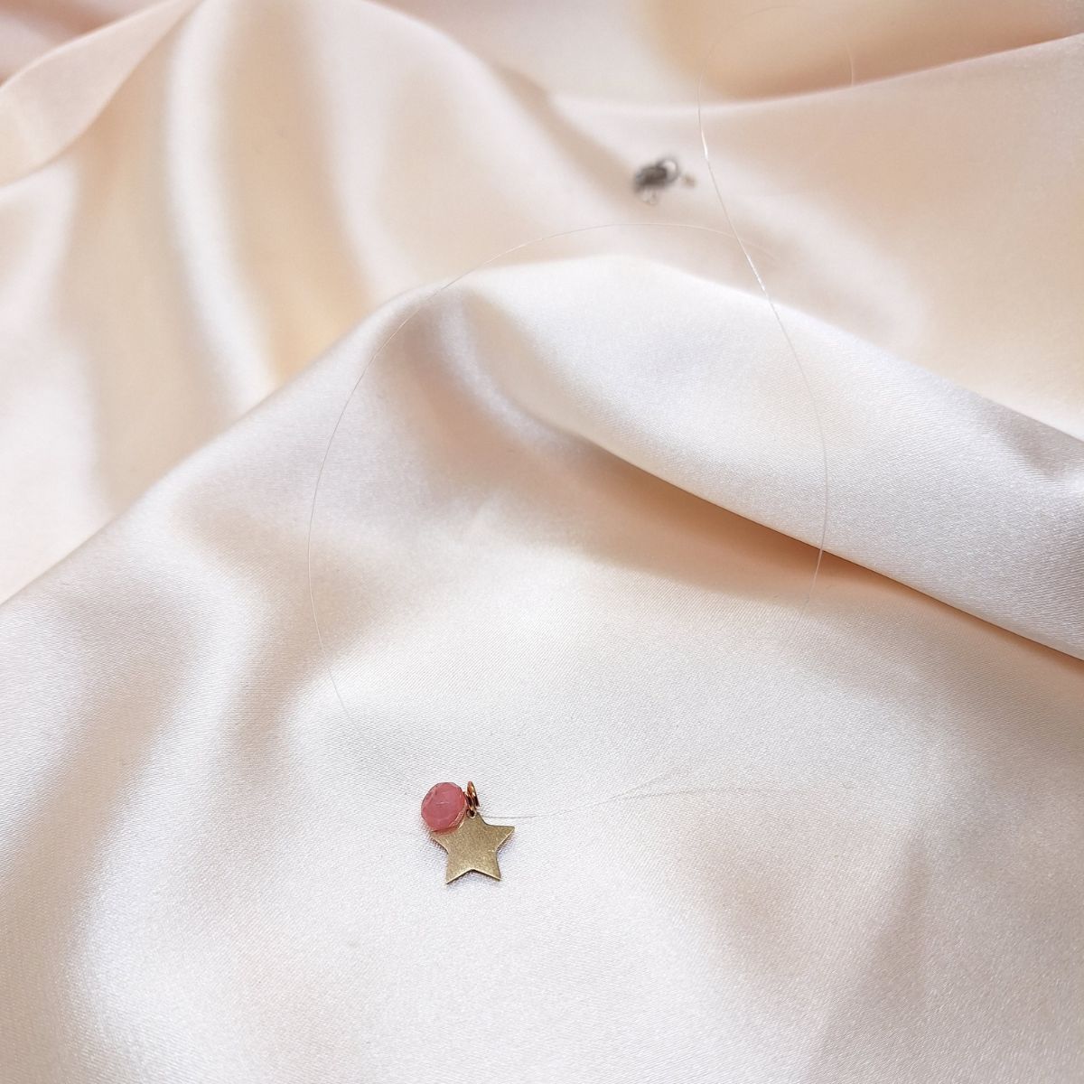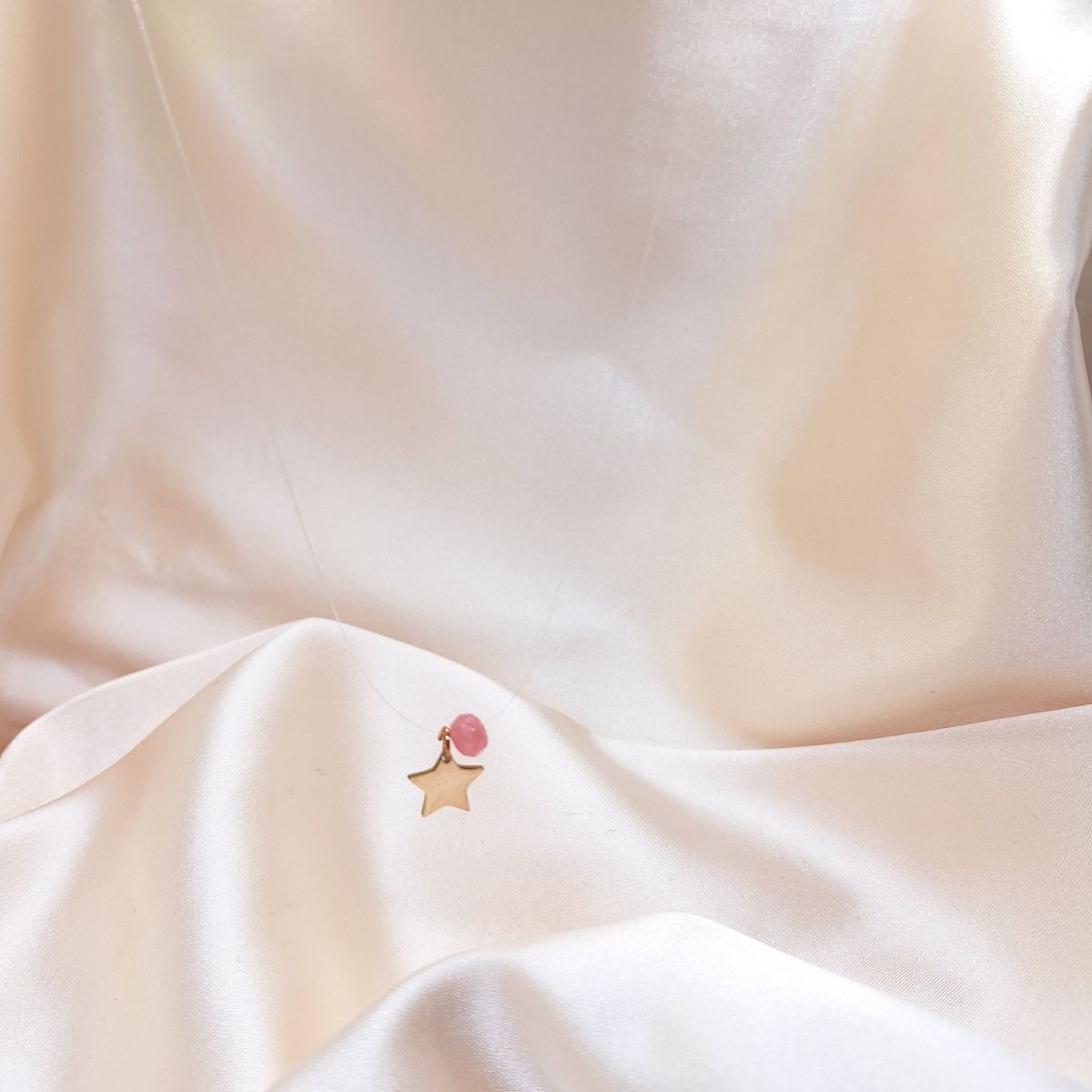 Ogrlica Ružična zvijezda oblikovana je kao diskretan, gotovo lebdeći detalj. Prozirna linija ostaje nenametljiva, dok privjesak u obliku zvijezde i poludragi kamen čine središte kompozicije.
