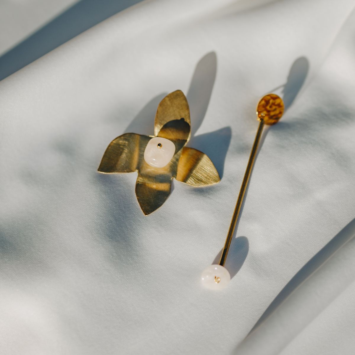Naušnice Cvjetna nota oblikovane su kao stilizirana cvjetna forma snažne prisutnosti, u kojoj se metalni elementi šire u slojevima i stvaraju osjećaj volumena i pokreta. Centralno postavljen kvarc unosi smirenu točku kompozicije i naglašava odnos forme i materijala.
