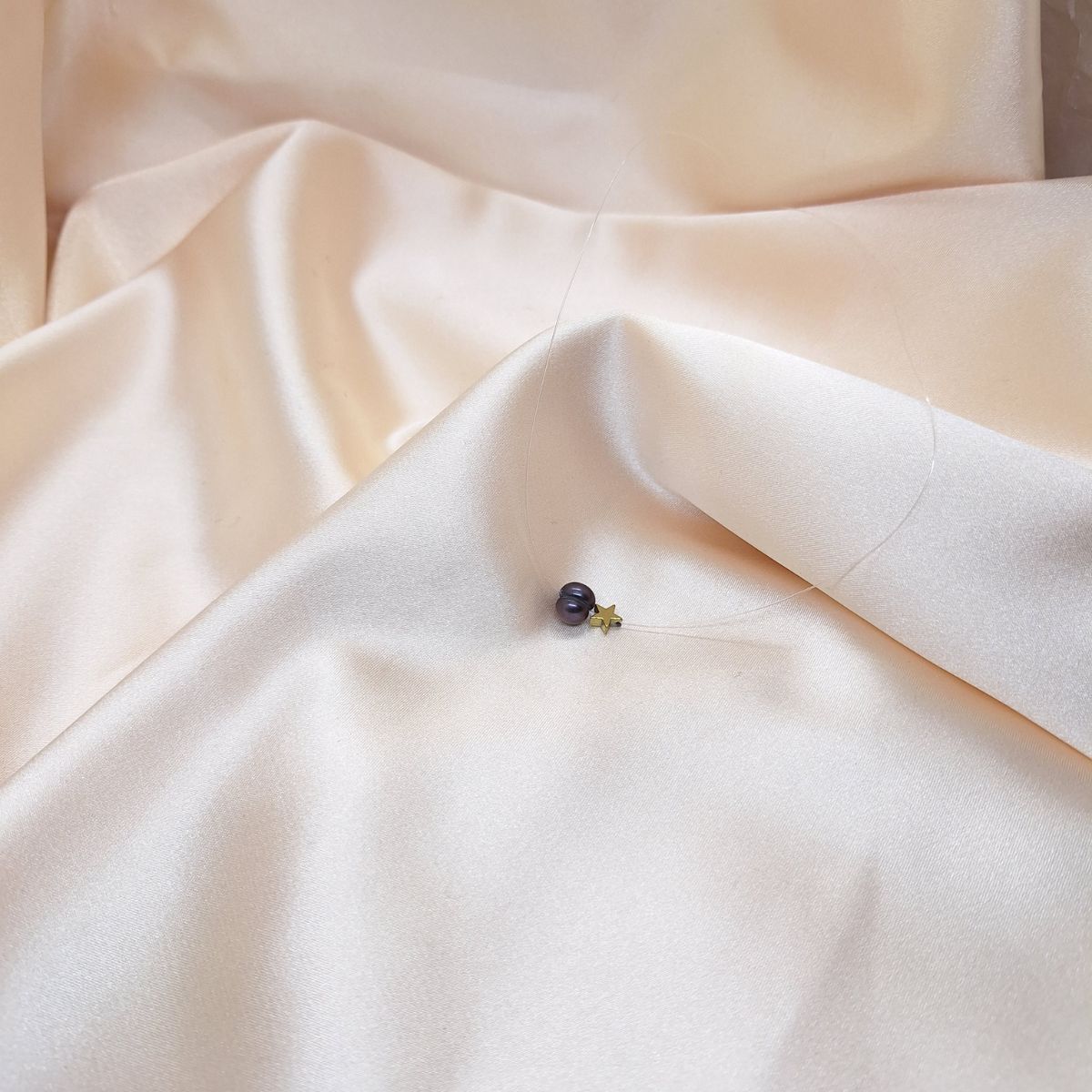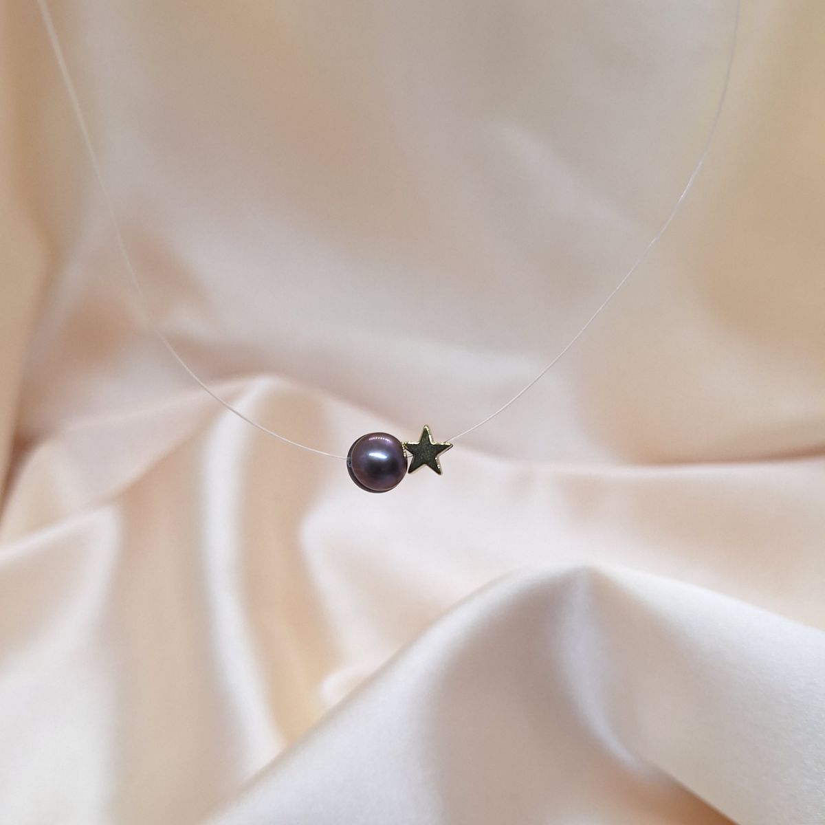 Vizualni identitet ogrlice proizlazi iz odnosa svjetla, tame i praznog prostora. Kontrast između sjajne površine bisera i suzdržanog tona hematita ostaje tih i uravnotežen, s naglaskom na materijal i jasnoću linije.