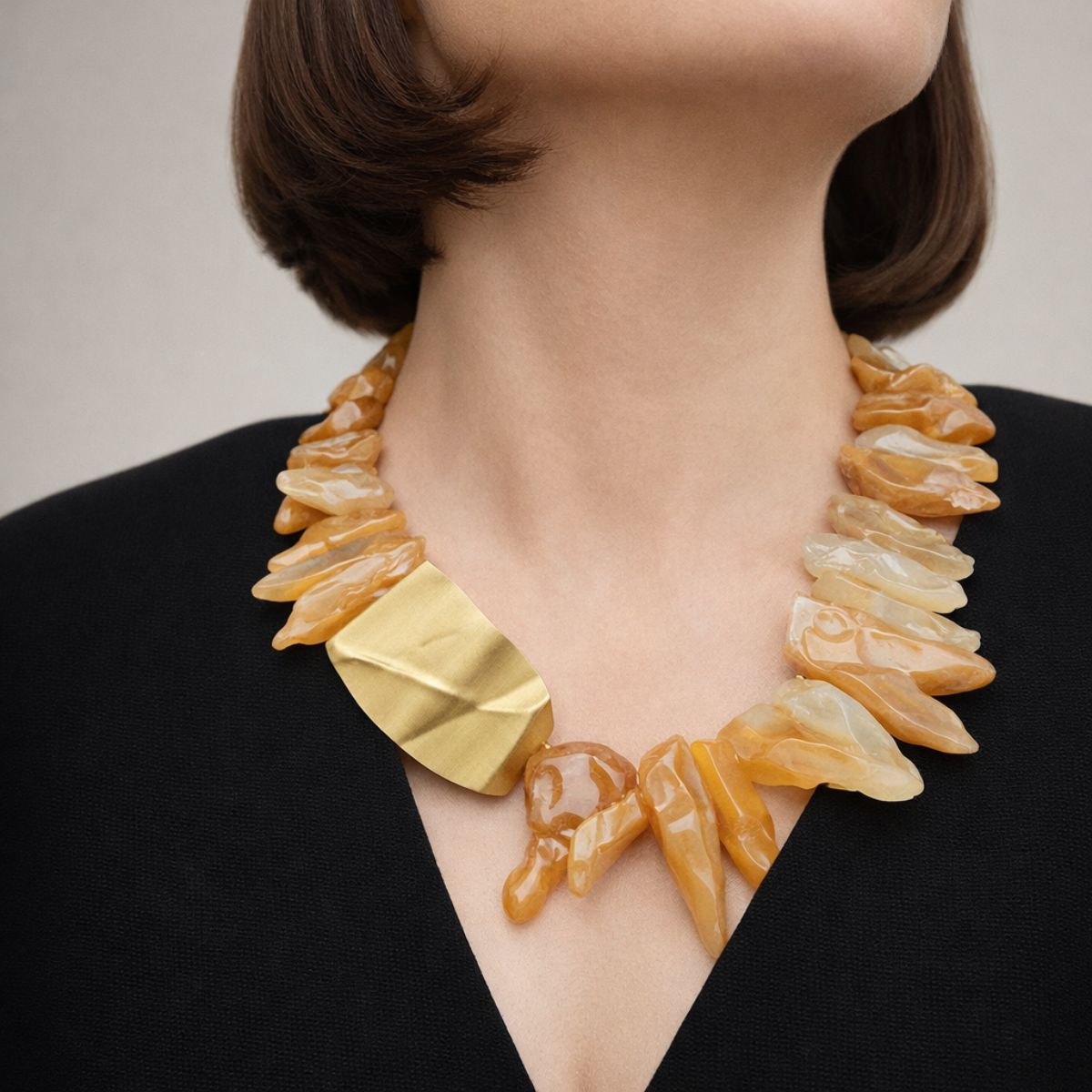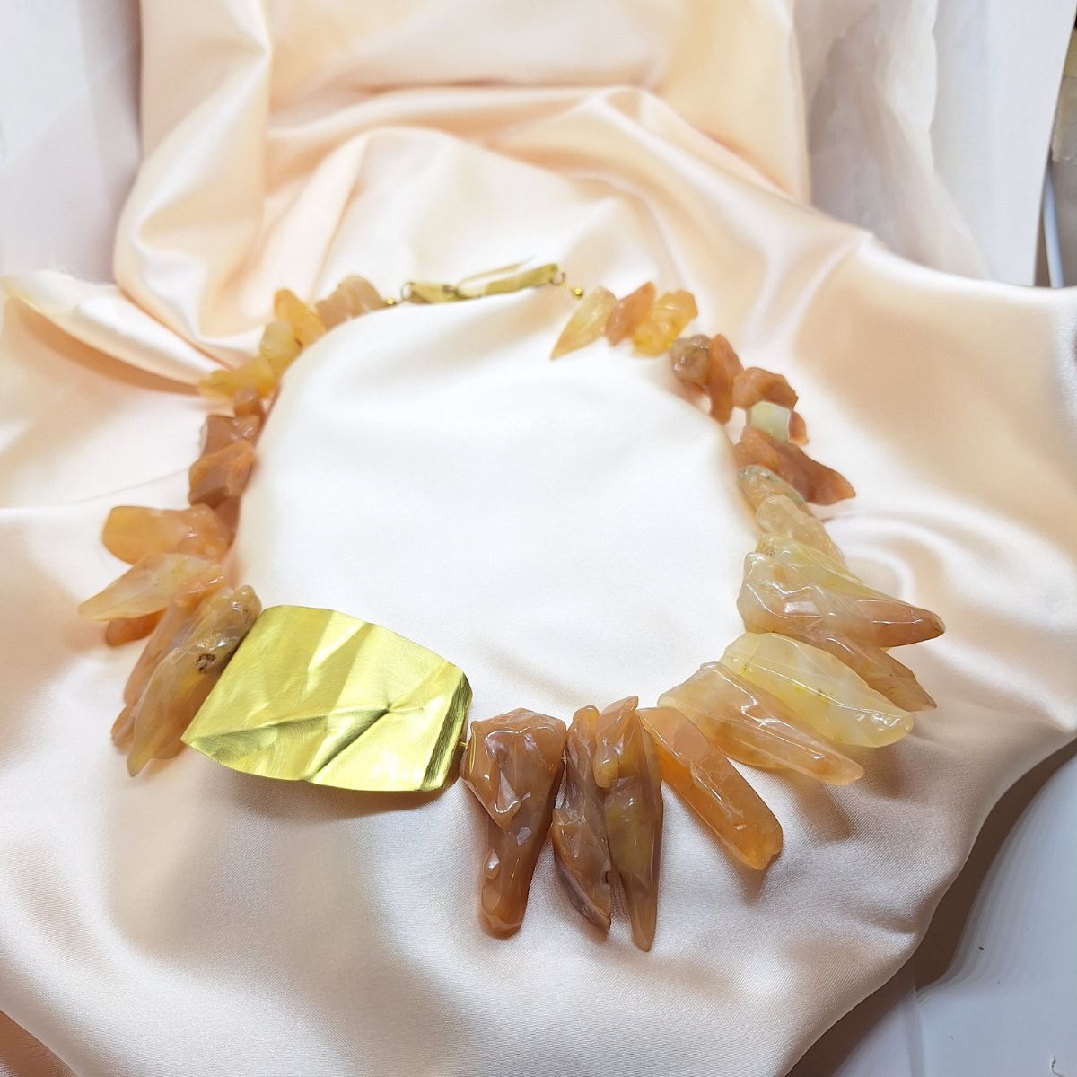 Ogrlica Zemljina iskra oblikovana je od neobrađenih komada karneola koji zadržavaju prirodnu teksturu, nepravilnost i snagu materijala. Sirovi kamen formira ritam oko vrata, dok centralni element od mjedi unosi stabilnost i jasnoću kompozicije.