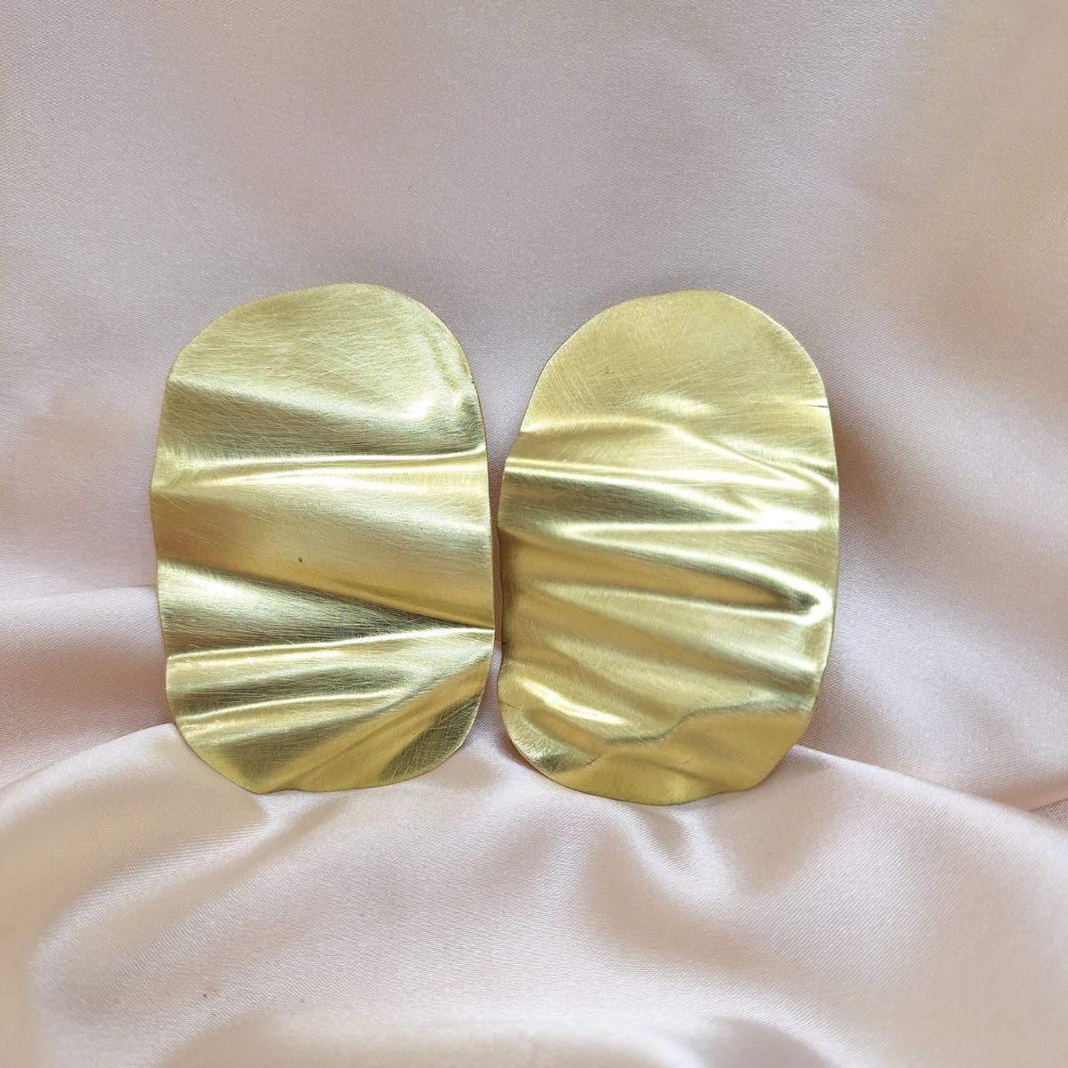 The Bold Brass Oval earrings are designed as strong, compact forms with a rhythmic pattern of bends that create a textured surface. The brass is hand-worked to preserve visible traces of the making process, emphasizing light reflection through clear transitions and relief.