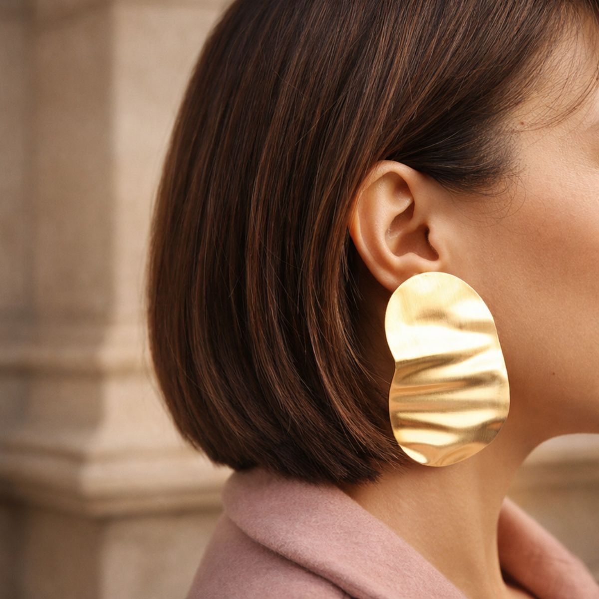 The design places material and form at the center of expression. Despite their size, the earrings maintain balance when worn and convey a bold yet controlled presence.