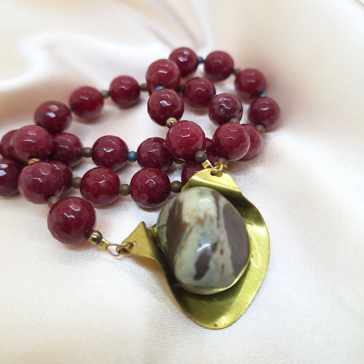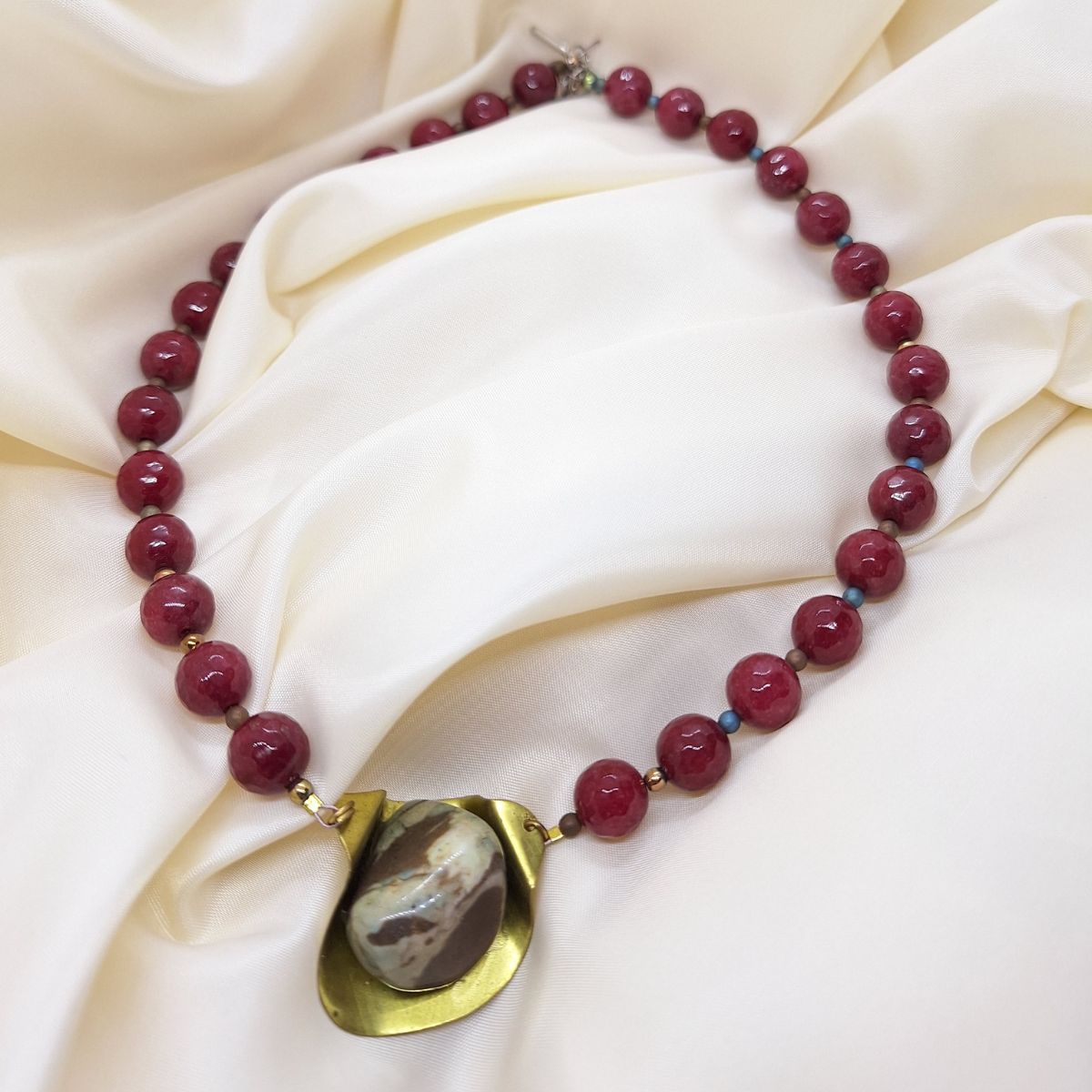 The Red Agate Note necklace is shaped as a powerful composition of colour, material, and volume. A rhythmic sequence of red agate leads the eye toward the central element, where the stone meets a boldly expressed metal surface.