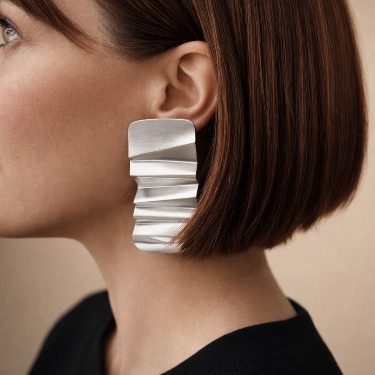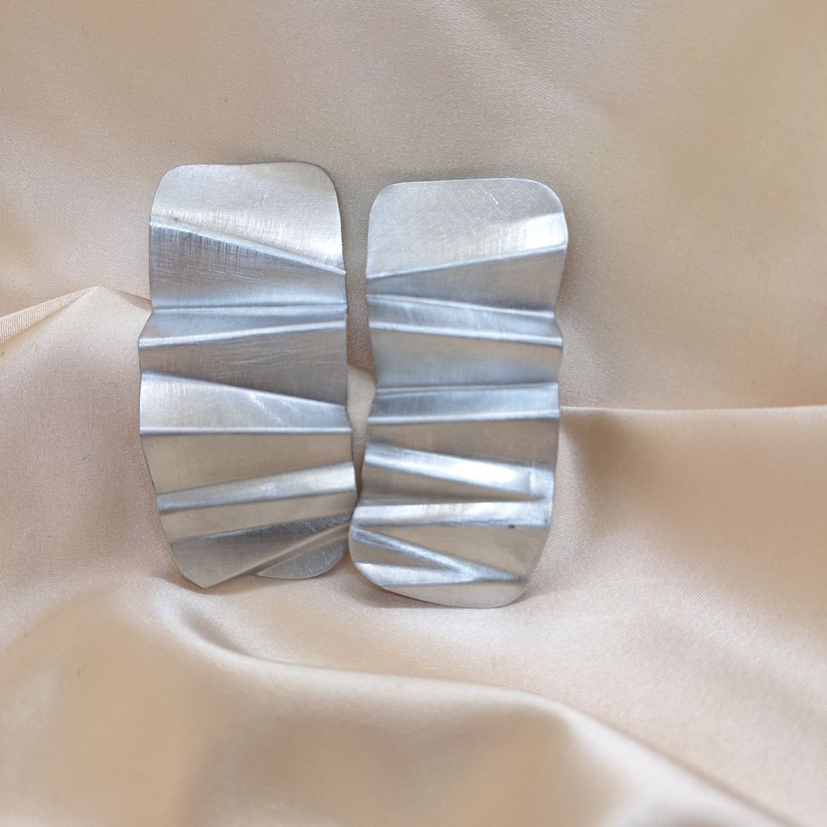 The Bold Aluminum earrings are designed as strong, flat forms with a pronounced rhythm of bends. The aluminium is hand-shaped and finished to create a wave-like surface that reflects light through clear transitions and textured relief.