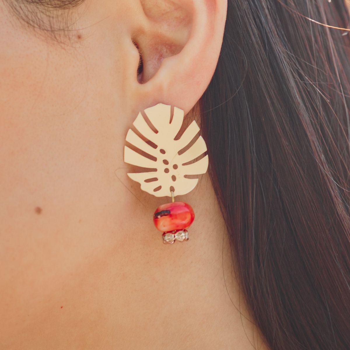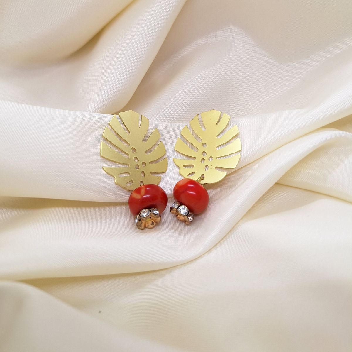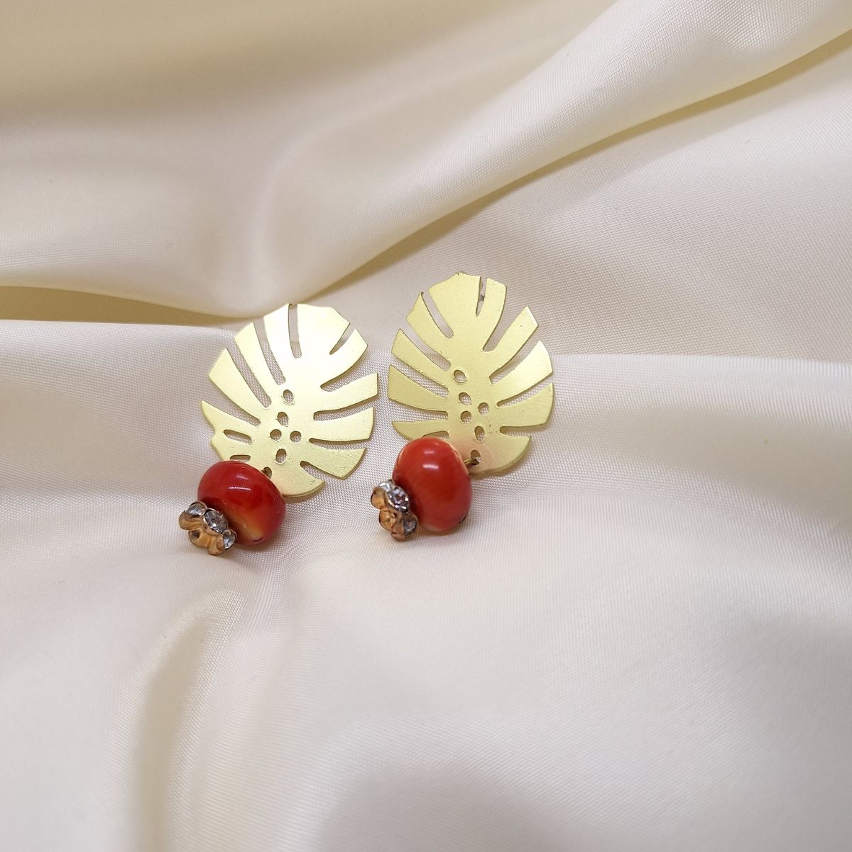 The Coral Drop earrings are designed as a combination of a stylized botanical form and a rounded coral drop. The metal element remains graphic and refined, while the coral introduces a focal point of colour and a soft sense of volume.