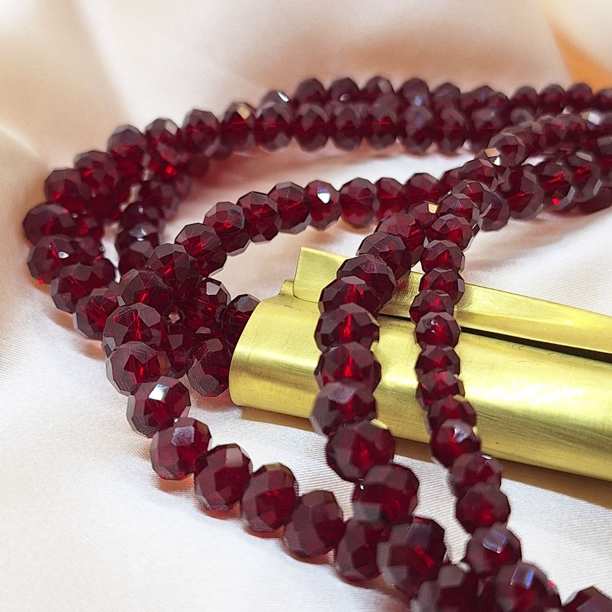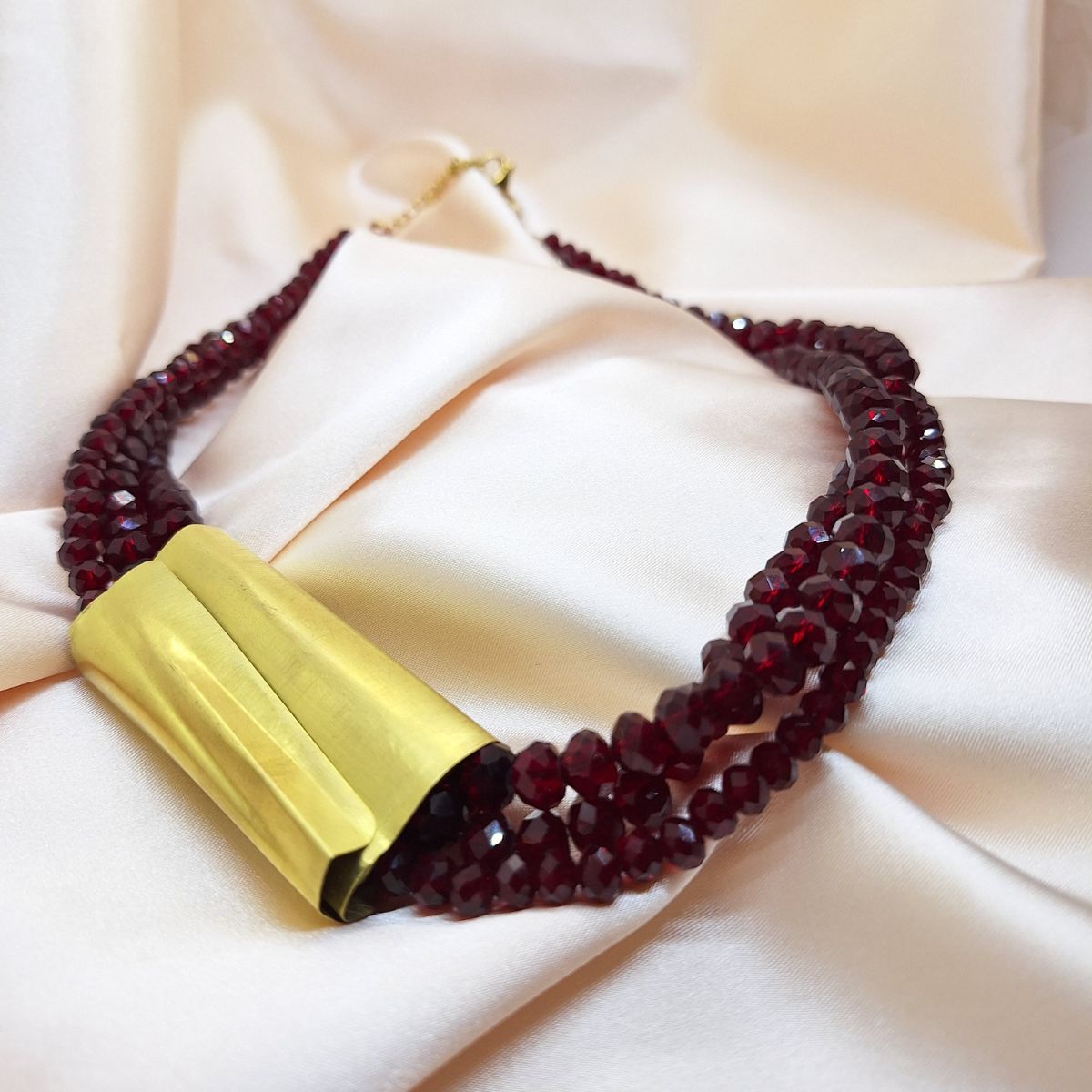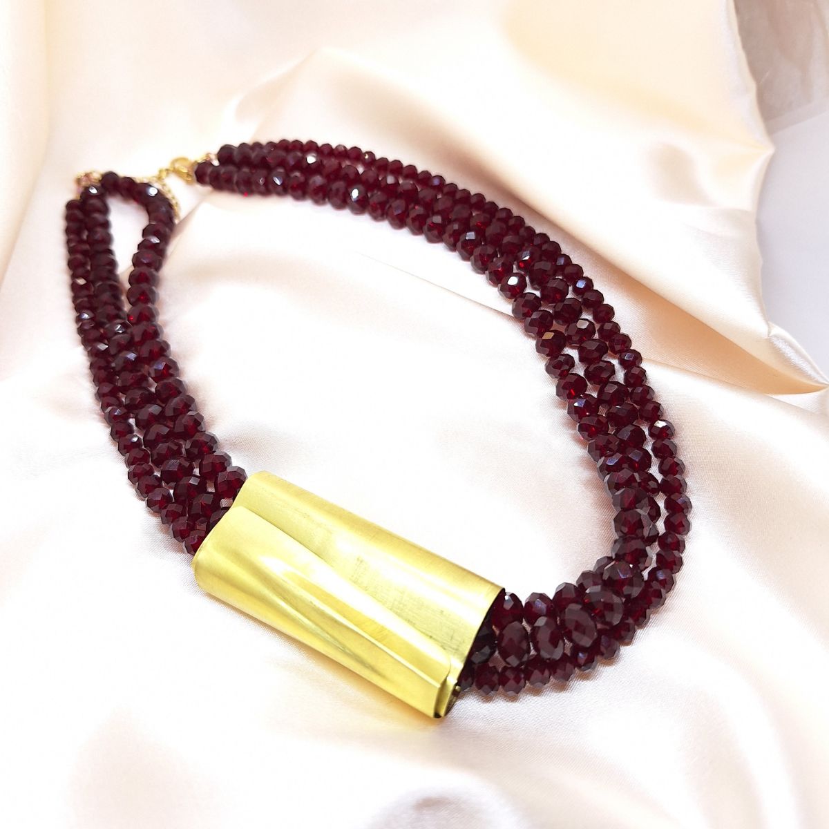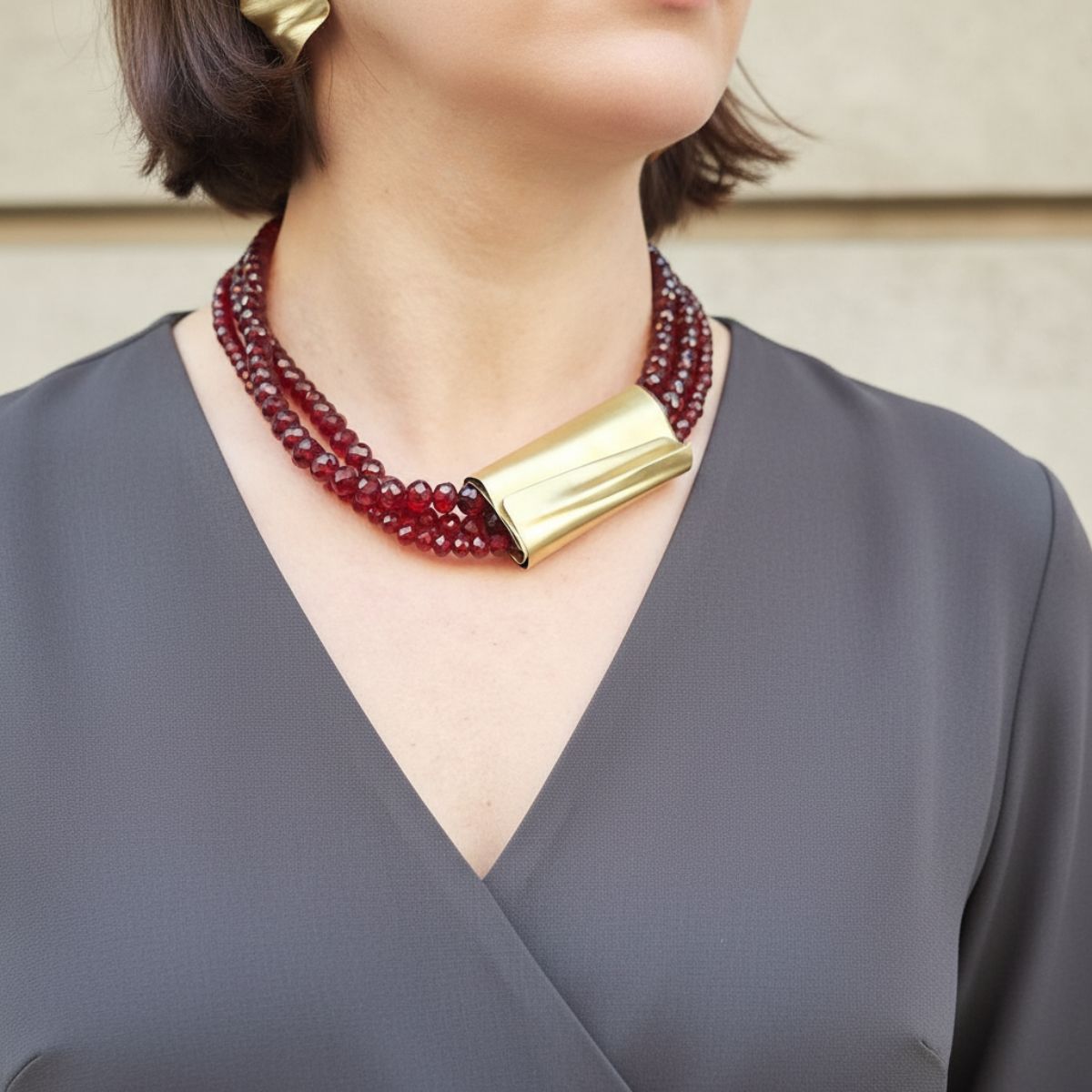 The Red Flame necklace is composed of multiple strands of fine glass crystals in an intense red hue. The layered structure creates fullness and rhythm, while the sparkle of the crystals highlights movement and light reflection.